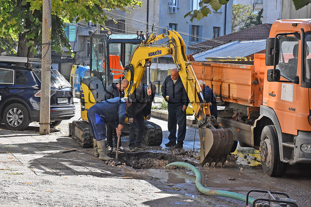 Екип на ВиК отстранява авария пред сградата на Жандармерията на улица „Антим I“ в Хасково.