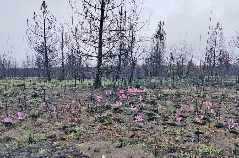 Есенни минзухари цъфтят сред въглените от летните пожари край тополовградското село Радовец, заснети от Йорданка Василева.