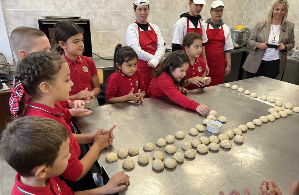 С аромат на прясно изпечен хляб премина и срещата с малките гости от втори клас на СУ „Васил Левски“ – Хасково, които се включиха в учебна практика на учениците от 10 г клас, специалност „Производство на хляб, хлебни и сладкарски изделия“, с ръководители инж. Ваня Михова и инж. Чавдарова.