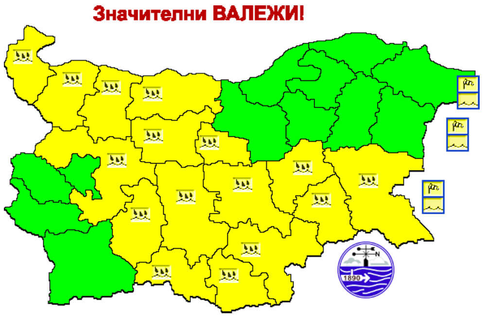 Очакваните количества са от 20 до 35 литра на квадратен метър за 24 часа. Предупреждението е в сила за всички общини в региона.
