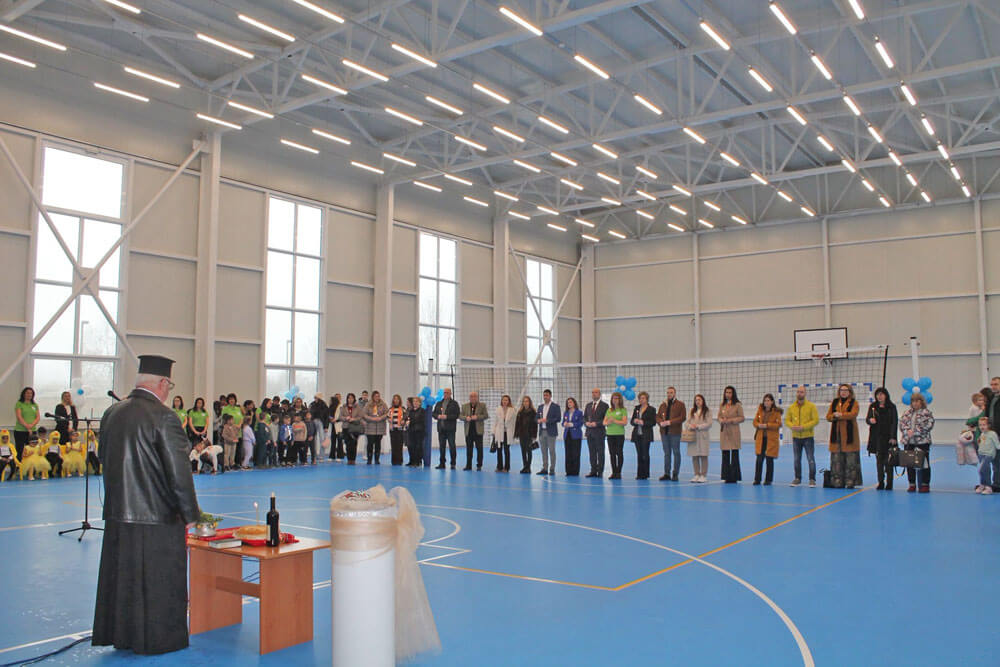 Там днес беше открит новоизграденият физкултурен салон. 126-те възпитаници на средищното училище, на възраст от 4 години до 7 клас, вече ще могат да провеждат часовете по физическо възпитание и спорт в нова модерна и уютна зала.