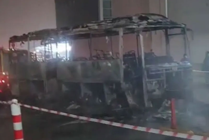 Инцидентът е станал половин час след полунощ. Шофьорът е спрял пред безмитния магазин, където влезли повечето пътници. Тогава превозното средство се е самозапалило.
