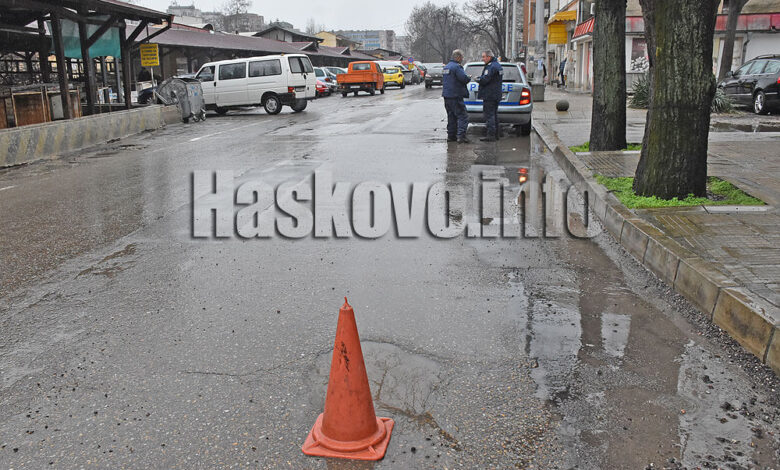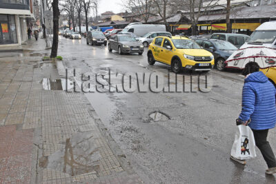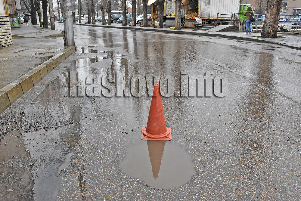 Екип на общинска полиция обезопаси по обяд дупка в асфалта на булевард „България“ до зеленчуковия пазар в Хасково.