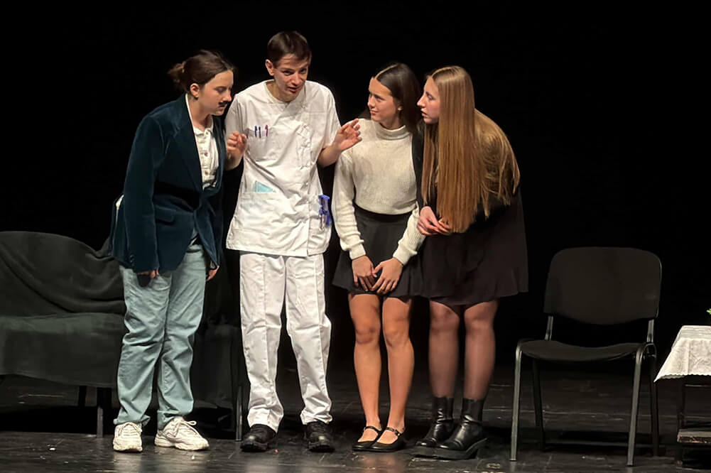 На сцената на НАТФИЗ „Кръстьо Сарафов“ младите актьори са представили пиесата „Четири сърца със спирачка и на заден ход“ от испанския драматург Енрике Понсела. Учениците от 8ж и 10ж клас са впечатлили журито и публиката и са се наредиха сред най-добрите ученически трупи в страната.
