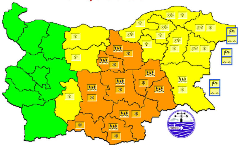 Предупреждението е в сила за всички общини, като очакваното количество за денонощие е между 35 и 65 литра на квадратен метър.