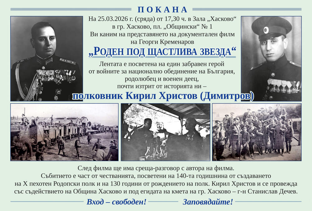 В навечерието на Деня на полка, на 25 март, от 17:30 ч. в зала „Хасково“ ще бъде излъчен филмът „Роден под щастлива звезда“. Автор на документалната лента е Георги Кременаров. Филмът е посветен на един незаслужено забравен герой от войните за национално обединение на България – полк. Кирил Христов. Събитието е част от честванията, посветени на 140 години от създаването на Десети Родопски пехотен полк.