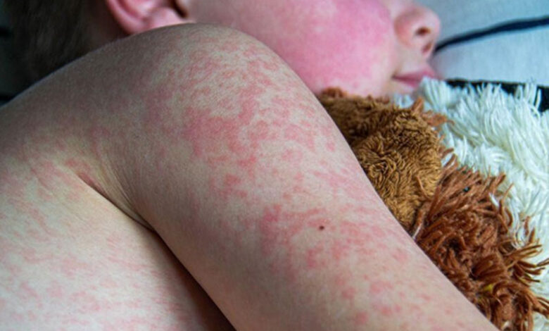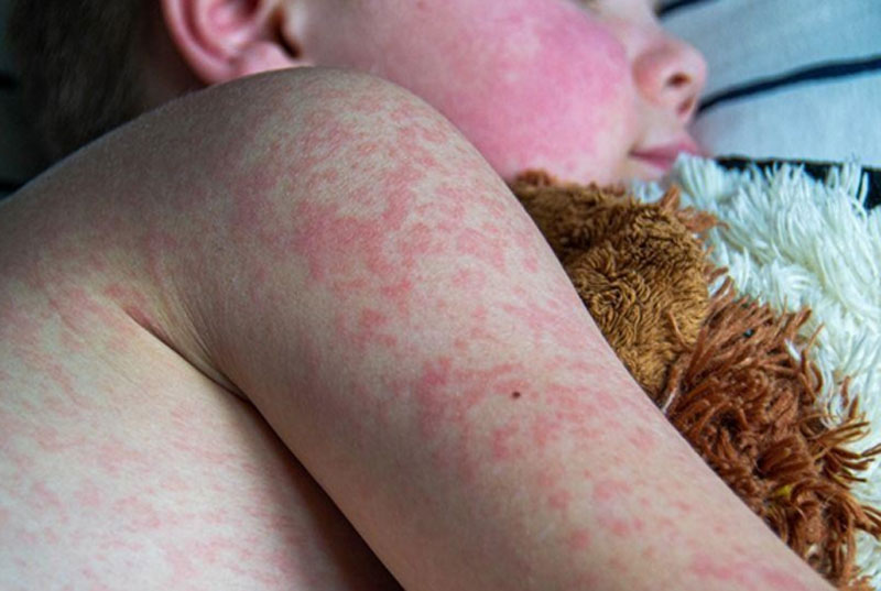 Важно е също родителите да бъдат наблюдателни за първите симптоми. Заболяването започва с хрема, кашлица и повишена температура, последвани от зачервени и чувствителни към светлина очи. В следващите дни температурата може да достигне до 41 градуса, а характерният обрив започва от лицето и се разпространява по тялото.