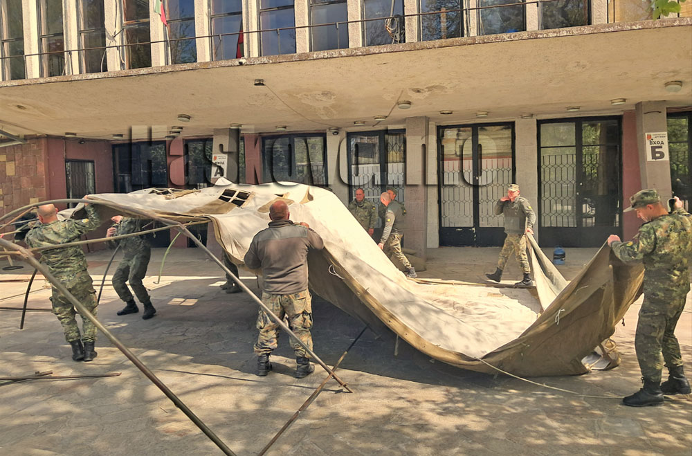 Днес в хасковската зала „Дружба“ бяха разположени масите и компютрите за екипите на РИК и Информационно обслужване, които ще приемат бюлетините и книжата в изборната нощ. Военни разпънаха палатки пред централния вход на съоръжението.