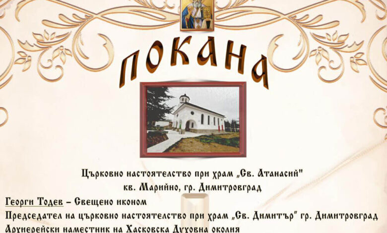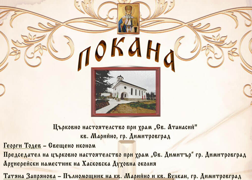 Обновената църква „Св. Атанасий“ в димитровградския квартал „Марийно“ ще посрещне своя храмов празник на 2 май – Летен Атанасовден, когато ще се проведе и традиционният в миналото събор на квартала, съобщават от общината.