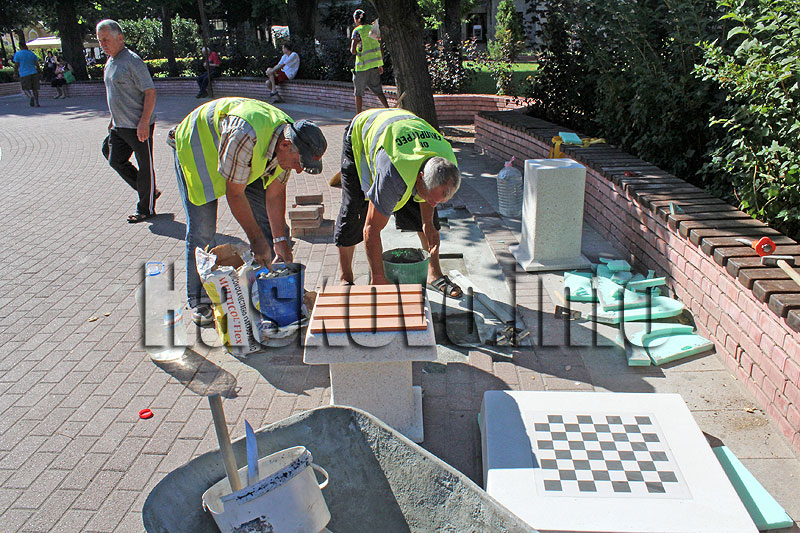 Масата със столовете е изработена от димитровградска фирма. Вече е подновена настилката и около новите обществени чешми в града.