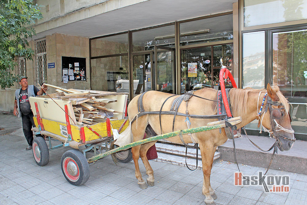 Каруца бе спряла днес на тротоара пред входа на УНСС-Хасково. От университета заявиха пред Haskovo.info, че правят ремонт, а в каруцата се товари вече ненужен дървен материал.