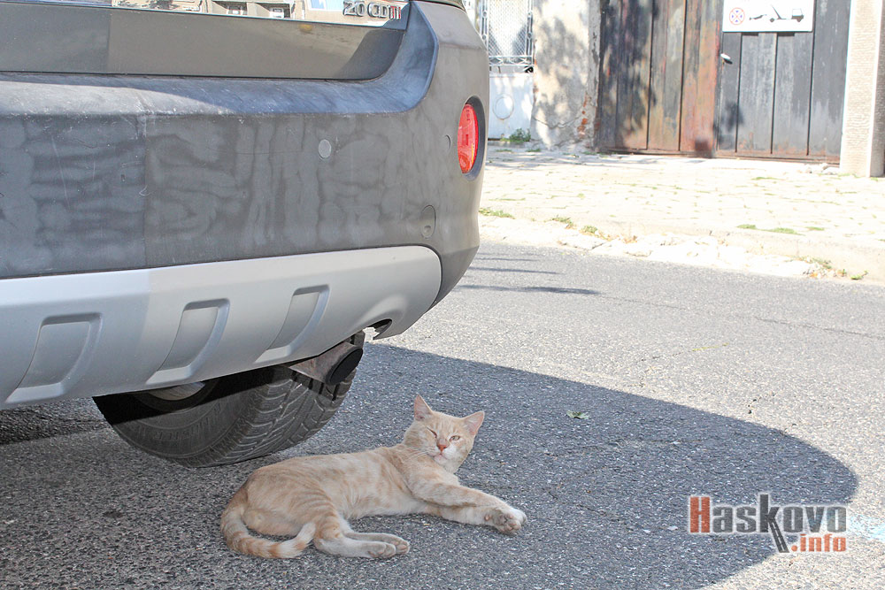 В хасковската жега рижава котка си направи следобедна дрямка под джип в центъра на областния град.