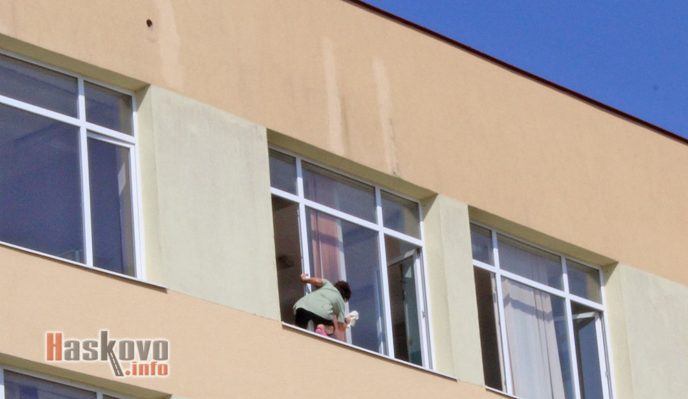 Чистачки в хасковската ГПЧЕ „Асен Златаров“ бършат прозорците на класните стаи в гимназията. Дори и на четвъртия етаж жените смело стъпваха по первазите за да почистят прозорците и отвън.