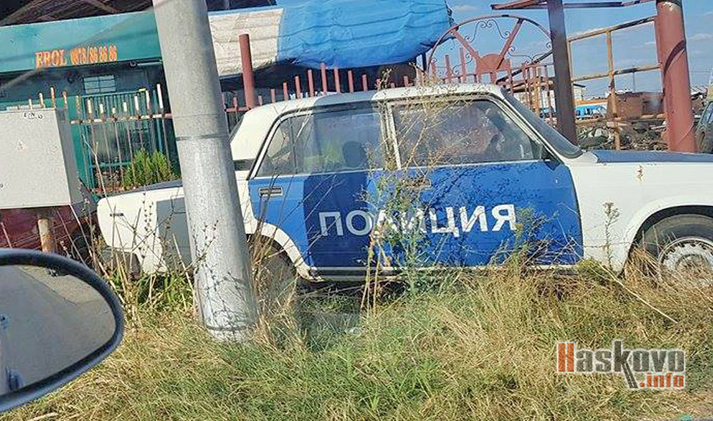Бракуван полицейски автомобил е оставен край пътя в хасковското село Манастир и привлича погледите на минувачи и шофьори.