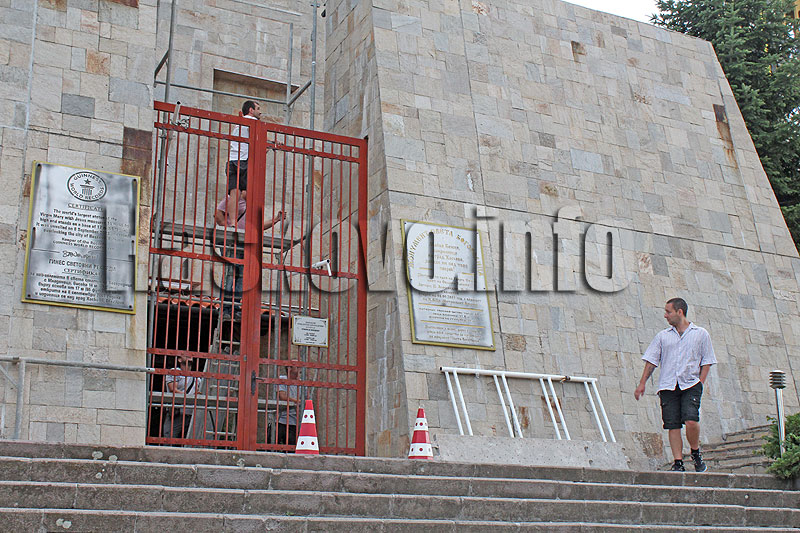 На входа има монтирано скеле и работници, които ремонтират облицовката зад затворената метална порта с конуси пред нея.