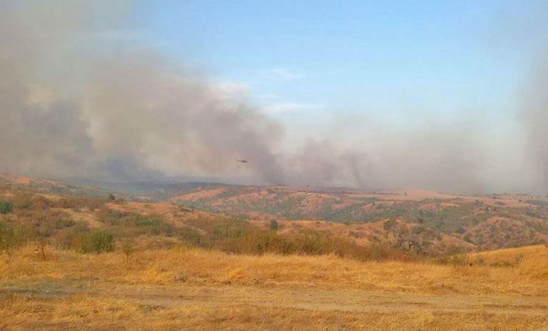 Голям пожар избухна край Доситеево, кметът с изгаряния, гаси и хеликоптер