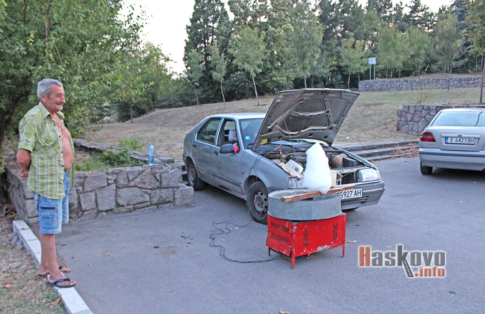 Търговец си пусна ток от колата за да захрани машината за захарен памук, който продава на Ямача в Хасково, сниман от впечатлени читатели на Haskovo.info.