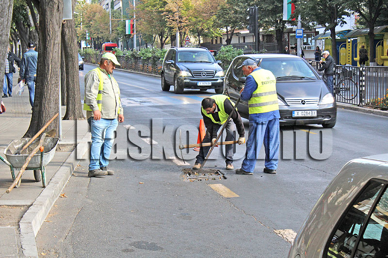 Работници от „Екопрогрес“ вече втори ден чистят затлачените през летните месеци шахти по булевард „Раковски“ в Хасково.
