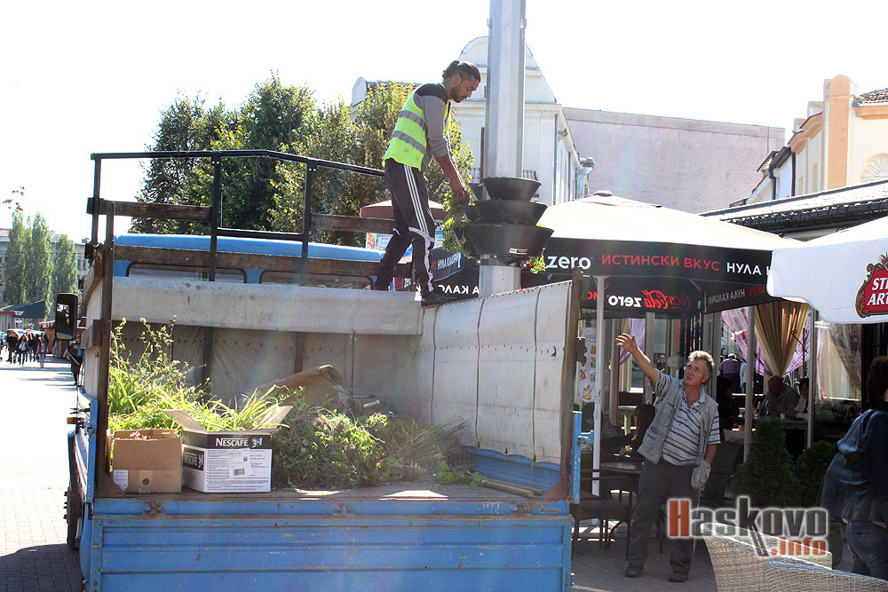 Работници от „Екопрогрес“ започнаха прибирането на цветята от центъра на Хасково преди зимата. В близките дни ще бъдат вдигнати палмите и столетниците.