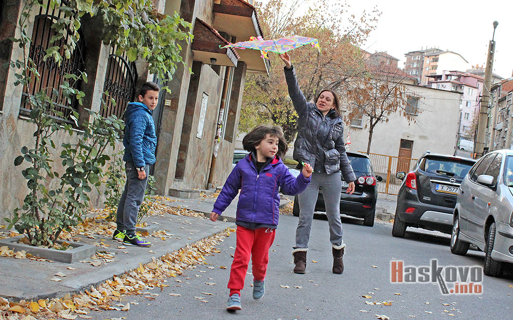 Децата на хасковско семейство намериха начин да се забавляват и във вятъра като пускаха хвърчило между блоковете на улица „Добруджа“.