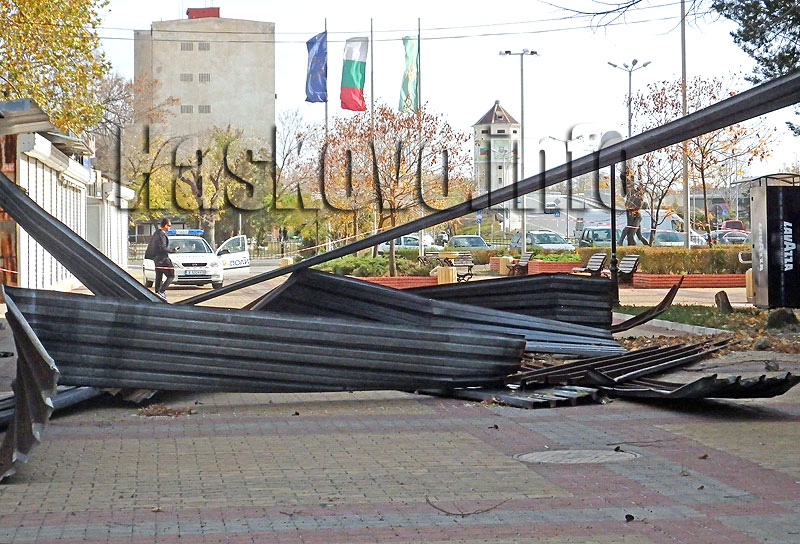 Под напора на вятъра големи парчета ламарина се стовариха на площада и пред единия от входовете на залата. Бурята е откъртила е тежки релси, с които са били закрепени ламарините. Други парчета пък висят от покрива.