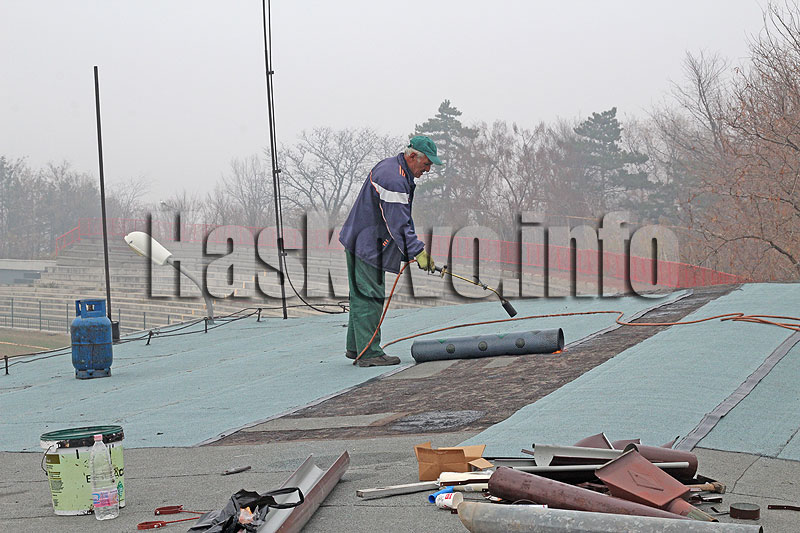 Спешен ремонт на покрива на стадиона в Хасково стартираха от общината. От кметството обясниха, че работата е стартирала заради течове в помещенията.