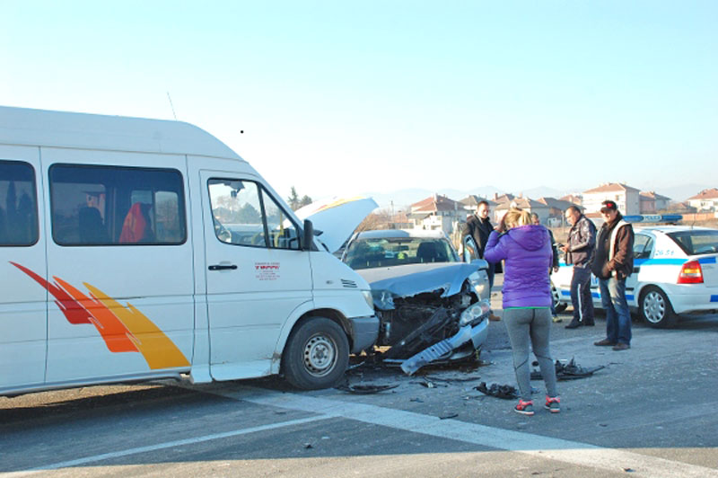 При катастрофата леко е засегнат фирмен микробус, в който са се ударили понесените от инерцията две леки коли.