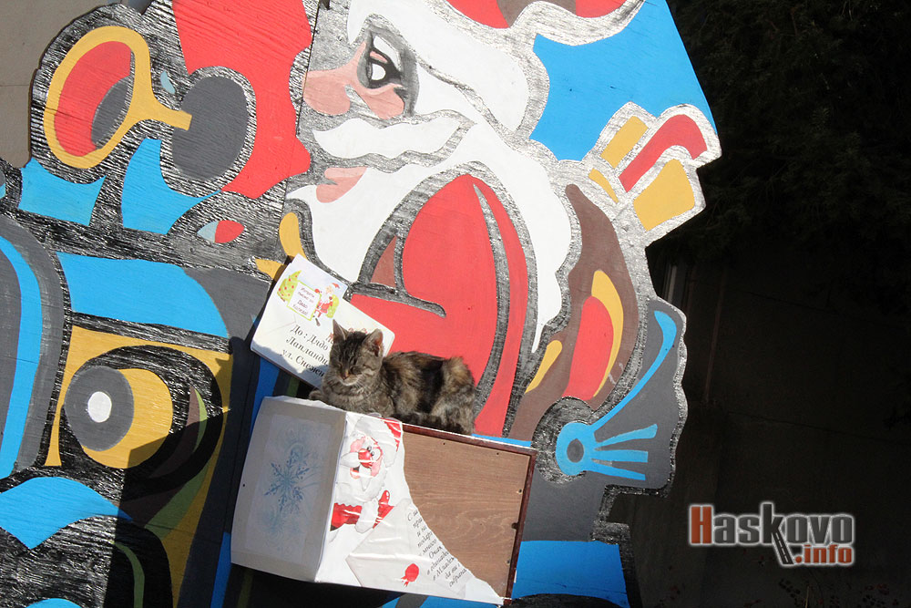 Котка легна на припек върху кутията за писма до Дядо Коледа пред хасковското читалище "Заря".