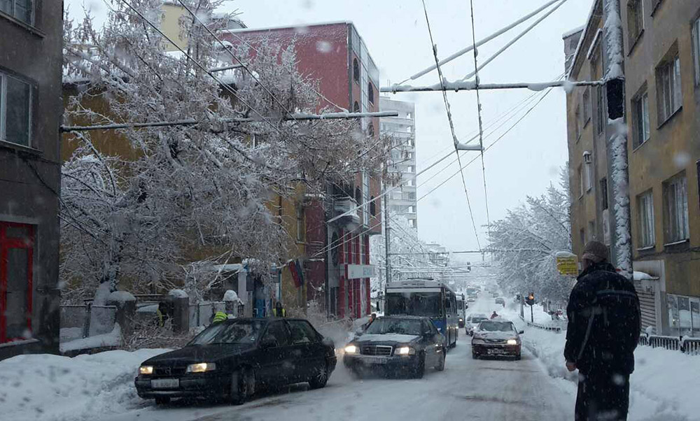 Спрени са и тролеите, а огромна част от улиците в града са непроходими. Социалните мрежи са пълни със сигнали за снежната обстановка.