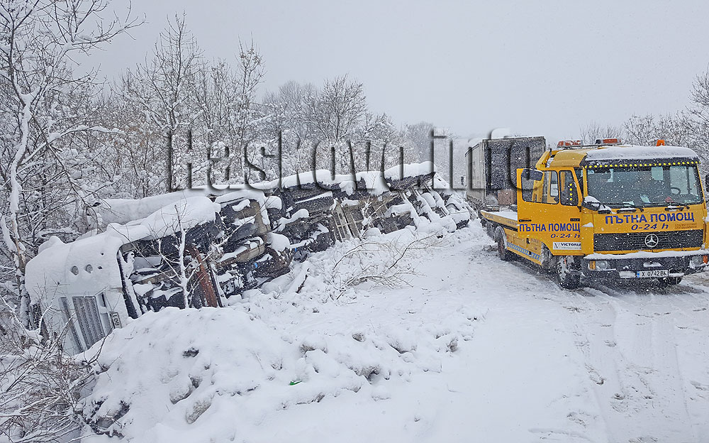 Тир с печки се обърна на Е-80, затвориха пътища заради големи снегонавявания