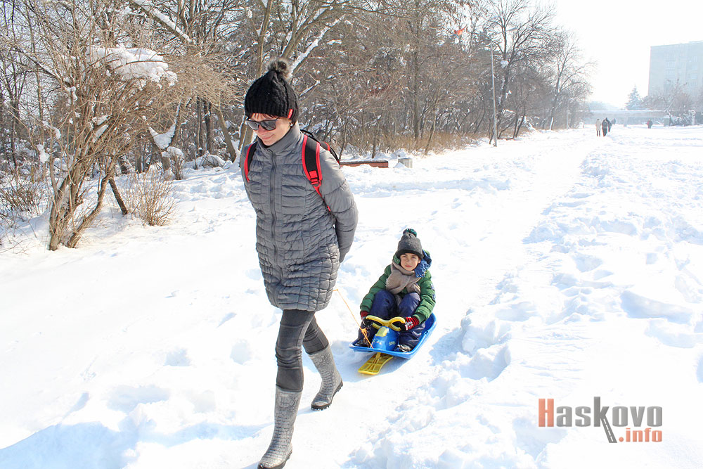 Хасковлии използваха омекването на времето в следобедните часове за разходки на Кенана, включително и с шейни.