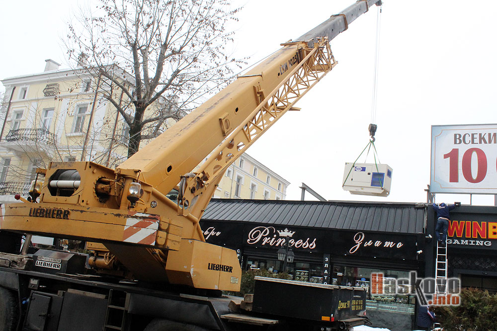 Генератор за електричество с тегло около 1.2 тона бе спуснат с кран върху покрива на сграда до ЦУМ-а в Хасково.