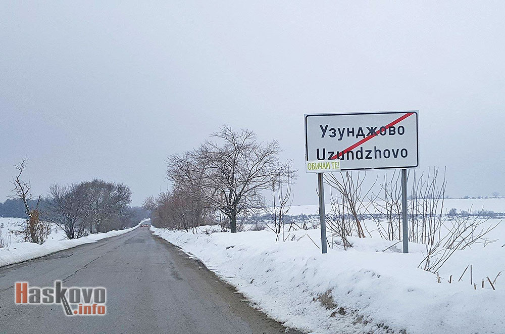 Надпис с текст "Обичам те!" е залепен на табелата в края на хасковското село Узунджово.