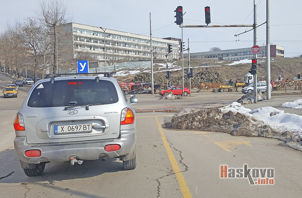Платното за завиващите на дясно към хасковския булевард „Васил Левски“ на светофара за ПМГ „Боян Петканчин“ е препречено от купчина лед и сняг.