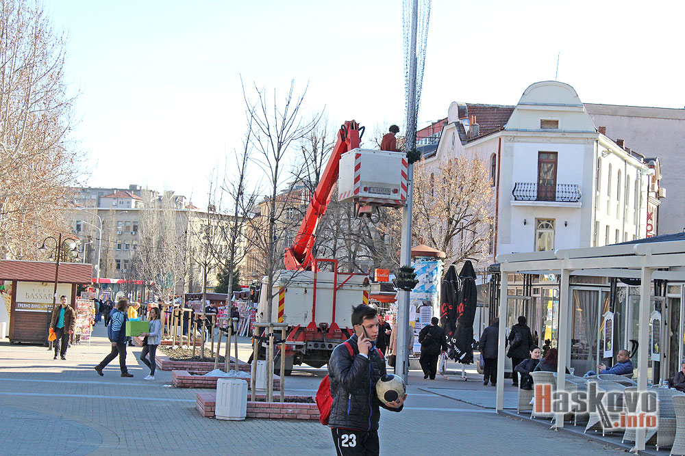 Със запролетяването дойде ред и за демонтирането на коледната украса в центъра на Хасково с помощта на вишка.