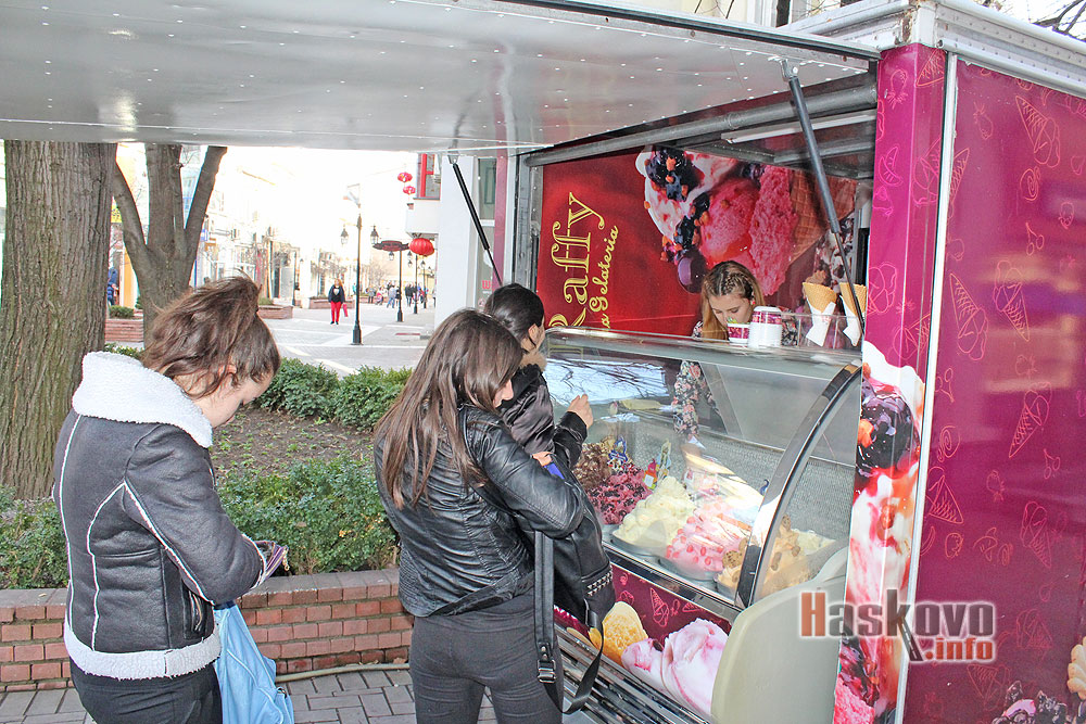 Със затоплянето на времето днес в центъра на Хасково отвори витрина за сладолед, пред която се образуваха опашки. Максималната температура в областния град е 16 градуса, а през следващите дни се очаква да е и по-топло.