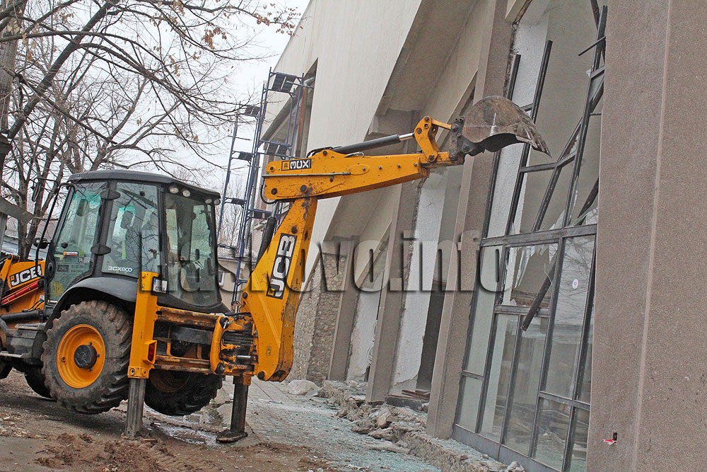 С багер се премахват старите дограми и стъкла на димитровградската спортна зала „Младост“, където се извършва обновяване за 3 млн. лв., отпуснати целево от държавата на 7 декември.