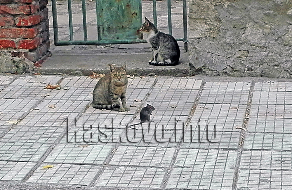 Котка и мишка съжителстват мирно на хасковски тротоар. Колкото и необичайна да е тази гледка, тя е факт.