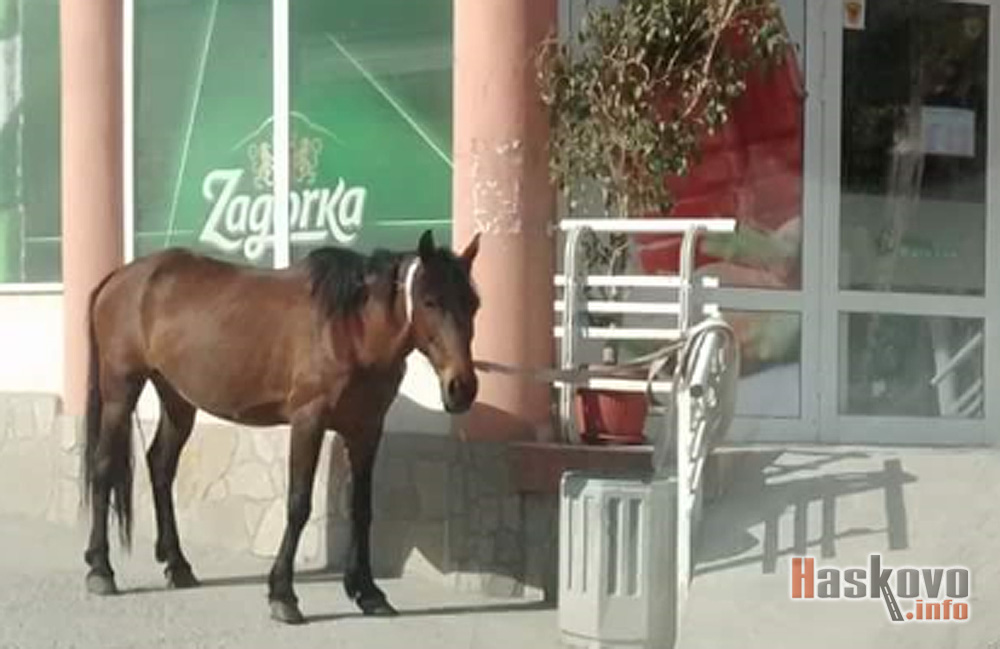 Читатели на Haskovo.info изпратиха снимка на кон, завързан пред магазин в хасковския квартал „Орфей“ – гледка, напомняща каубойските филми.