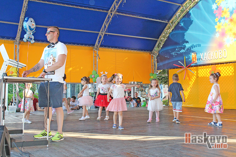 Щура лаборатория забавлява децата за 1 юни в центъра на Хасково, а след това на сцената имаше детска дискотека – Щуротека с DJ.