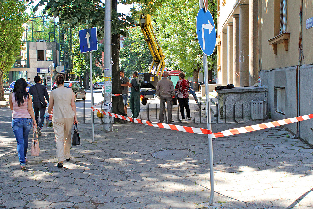 Ленти са опънати по тротоара пред съда, като за пешеходците е оставено място за преминаване до булевардното платно.