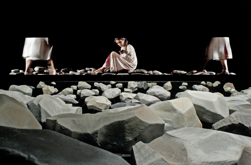 Близо половин тон камъни ще изпълнят голямата сцена на хасковския театър „Иван Димов“ в петък вечер за „Вграждане“. Оригиналната сценография е за спектакъла за възрастни на Куклен театър – Пловдив, който се играе при голям успех вече пети сезон.