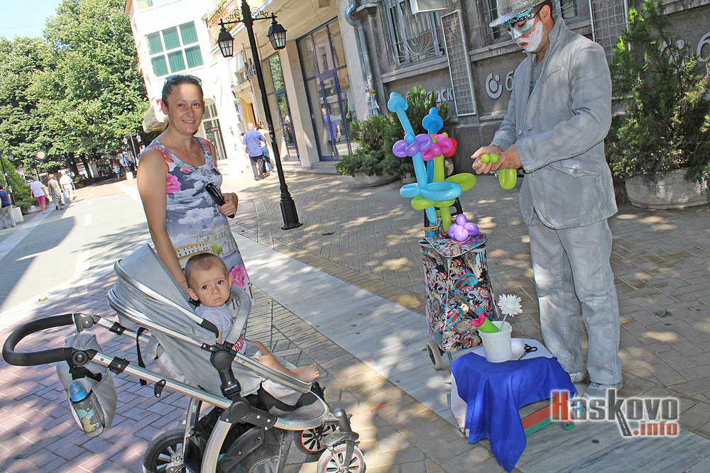 Артист забавлява децата с балони и фокуси по Главната в Хасково.