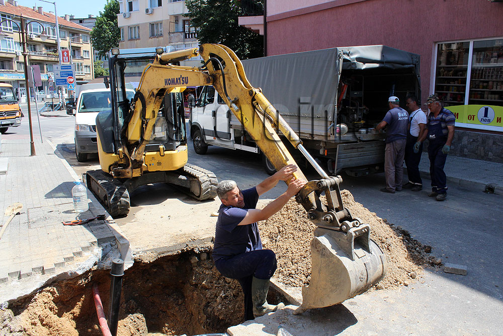 Спука се тръба под улица „Велико Търново“ от страната на пазарчето. Аварийният екип на водното дружество разкопа асфалта и тротоара, за да достигне до проблемната тръба. Заради струпването на техниката улицата остана затворена.