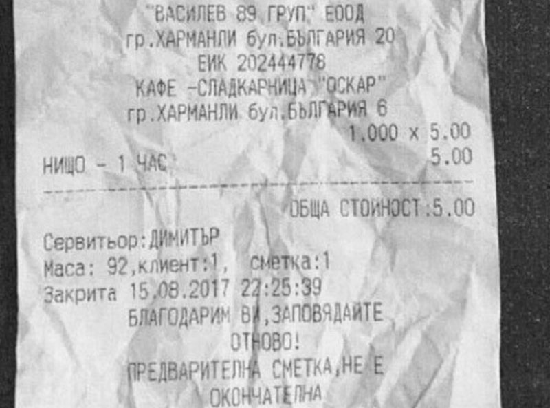 Според сигнала, подаден до Министерство на туризма, на 15 август тази година, посетителят е платил 5 лв. за „нищо-1 час“, както е отбелязано на касовата бележка, приложена към сигнала. От сметката се вижда, че от кафе-сладкарница „Оскар“ са поискали сумата в 22:25 часа.