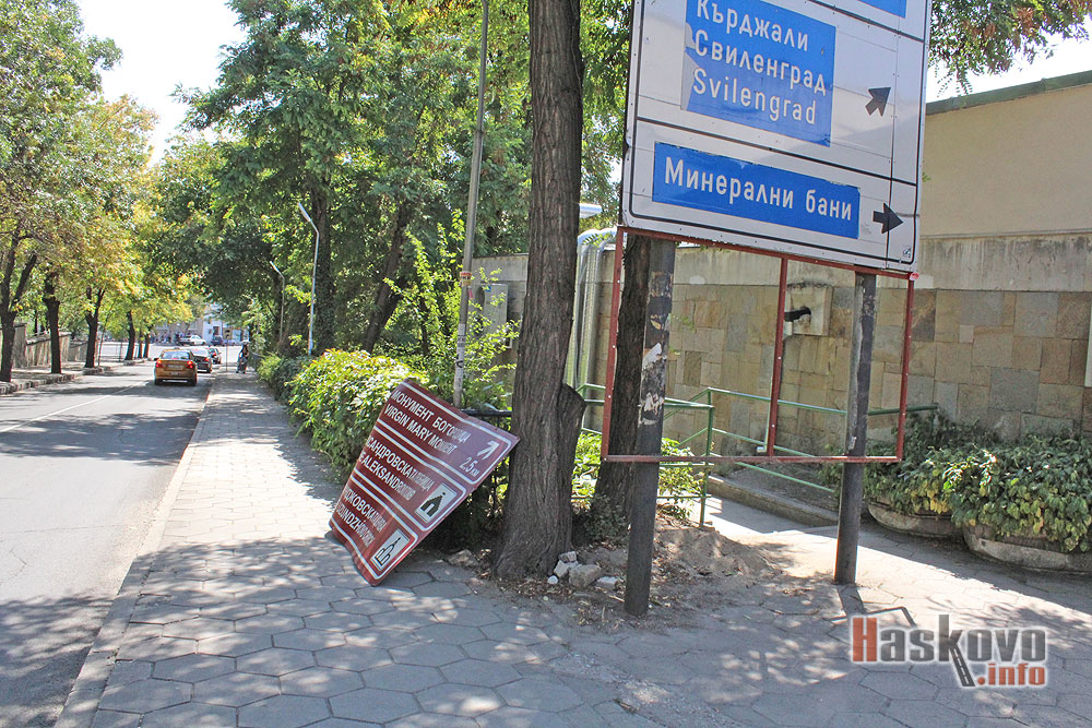Табела, указваща пътя за монумента на Богородица, Александровската гробница и Узунджовската църква, е смачкана на тротоара до Младежкия център в Хасково.
