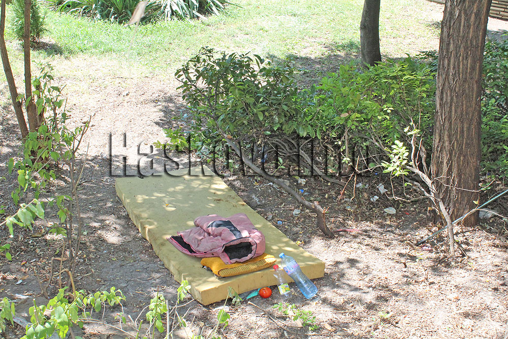 Човекът си е сложил матрак под дърветата, върху който е поставена възглавница, яке, има пластмасови бутилки и домат.