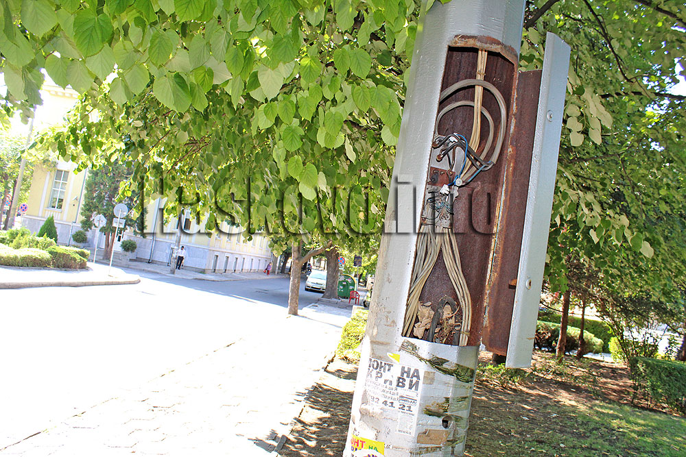 Стълбът се намира срещу Бизнесцентъра до тротоара откъм паркчето. От отворен капак се виждат доста кабели, като хората се притесняват, че там тече ток.