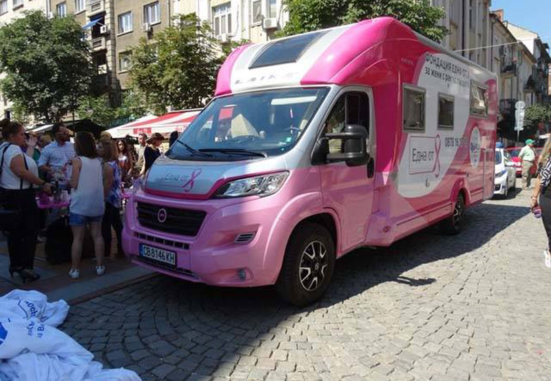 „Розов кемпер на Една от 8“ е част от проекта „Сърдечни приятелки“. В рамките на 6 месеца той ще обиколи 25 града в страната и главни онкологични болници.