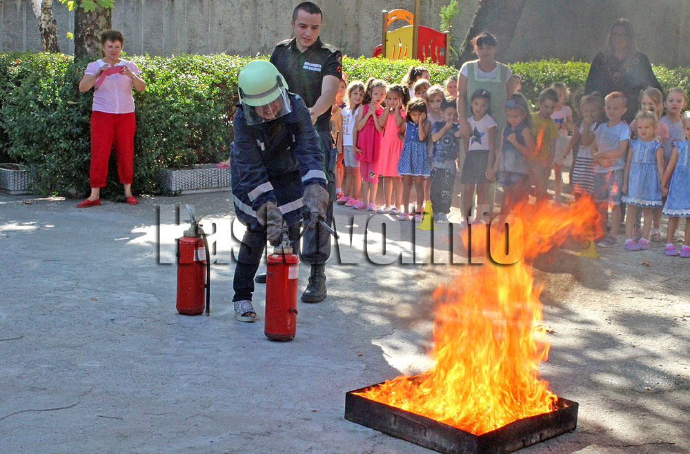 След като малчуганите бяха изведени на двора, пожарникарите запалиха огън и показаха на децата как се гаси – с пожарогасител в основата на пламъците. Повечето деца посрещнаха демонстрациите с ръкопляскания, други се разплакаха и бяха успокоени от учителките и огнеборците, които заслужиха и благодарствено писмо от детската градина.